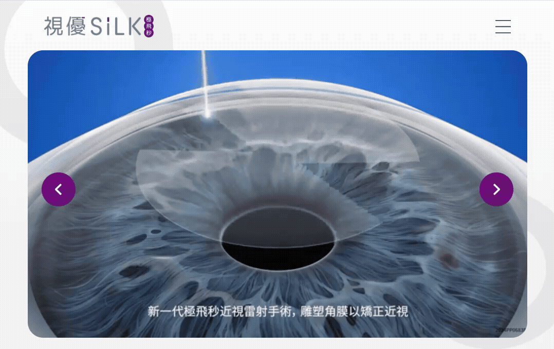 設計風格與整體氛圍:網站整體採用乾淨、科技感且專業的視覺風格,搭配眼科手術實拍與雷射科技圖示,展現 Silk‑Eye 對近視雷射技術的精準與信賴,用畫面傳遞安全感與專業形象。 網站架構 UI/UX:導覽選單清楚涵蓋「認識視優」「三大技術優勢」「適用對象」「院所介紹」「媒體報導」「QA」「聯絡我們」,使用者能依需求快速點擊進入相關內容,並在頁面中快速聯絡預約或諮詢。
